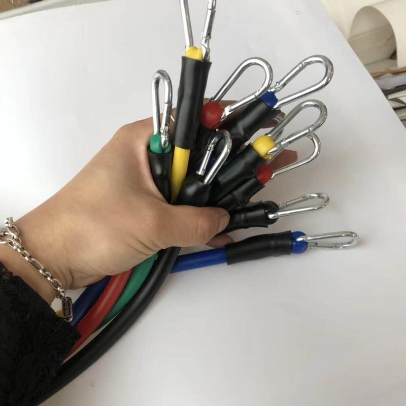 5 bandas elásticas: negra (13,6 kg), azul (11,3 kg), roja (9,1 kg), verde (6,8 kg), amarilla (4,5 kg)