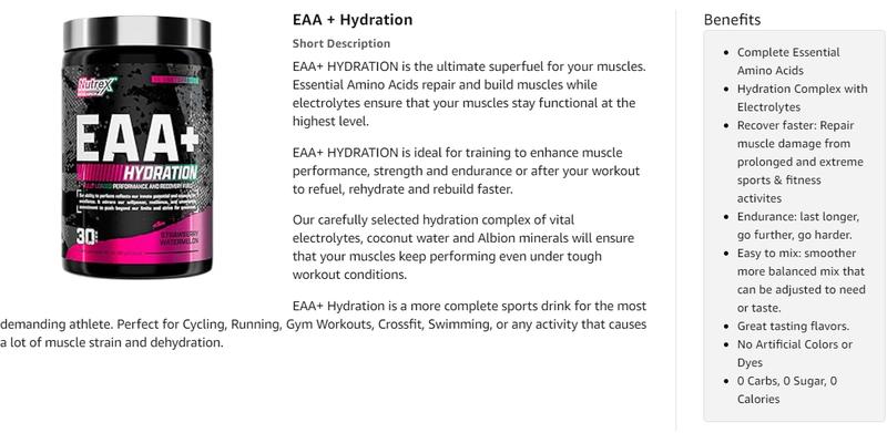 Nutrex Research EAA Hydration | Eaas + Bcaas Powder | Muscle Recovery, Strength, Muscle Building, Endurance | 8G Essential Amino Acids + Electrolytes | 30 Servings, Ideal Gym Diet Fitness Dietary Edible Supplement